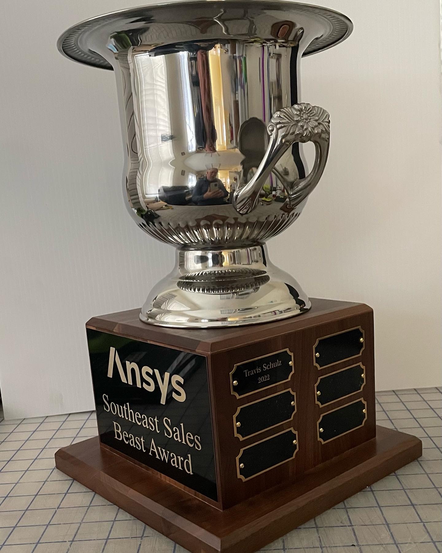 This is the Ice Bucket Trophy that I brought to Advantage Awards and it’s meant to chill a bottle of champagne for the winner. $250 but there’s nothing else like it with a real walnut wood base.
